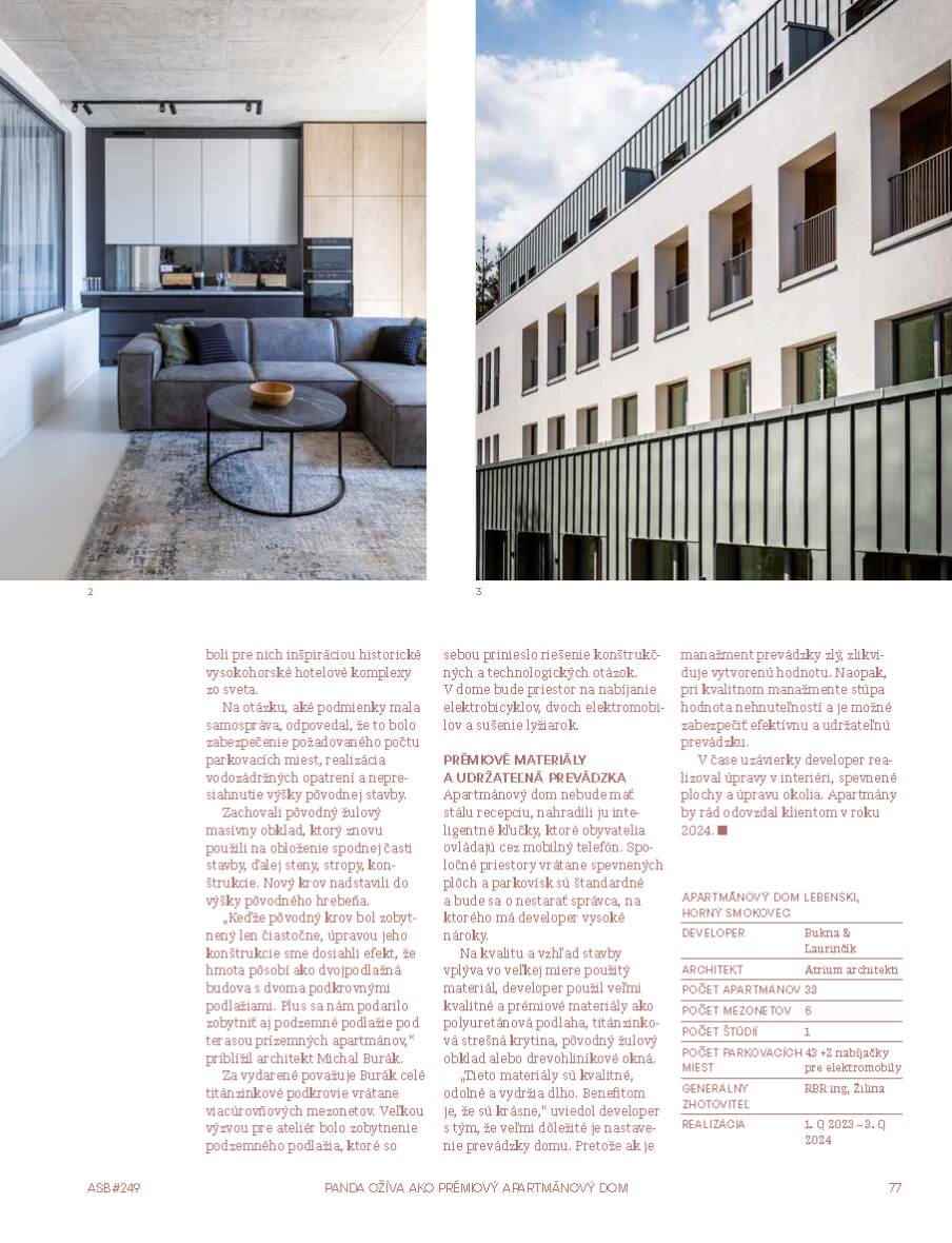ATRIUM ARC HITEKTI Renovation of former recreational facilities is the approach preferred by the city government of Vysoké Tatry. Orava developer Bukna & Laurinčík, in cooperation with an architectural studio from Košice, transformed the former Panda Hotel into a premium Lebenski apartment building.