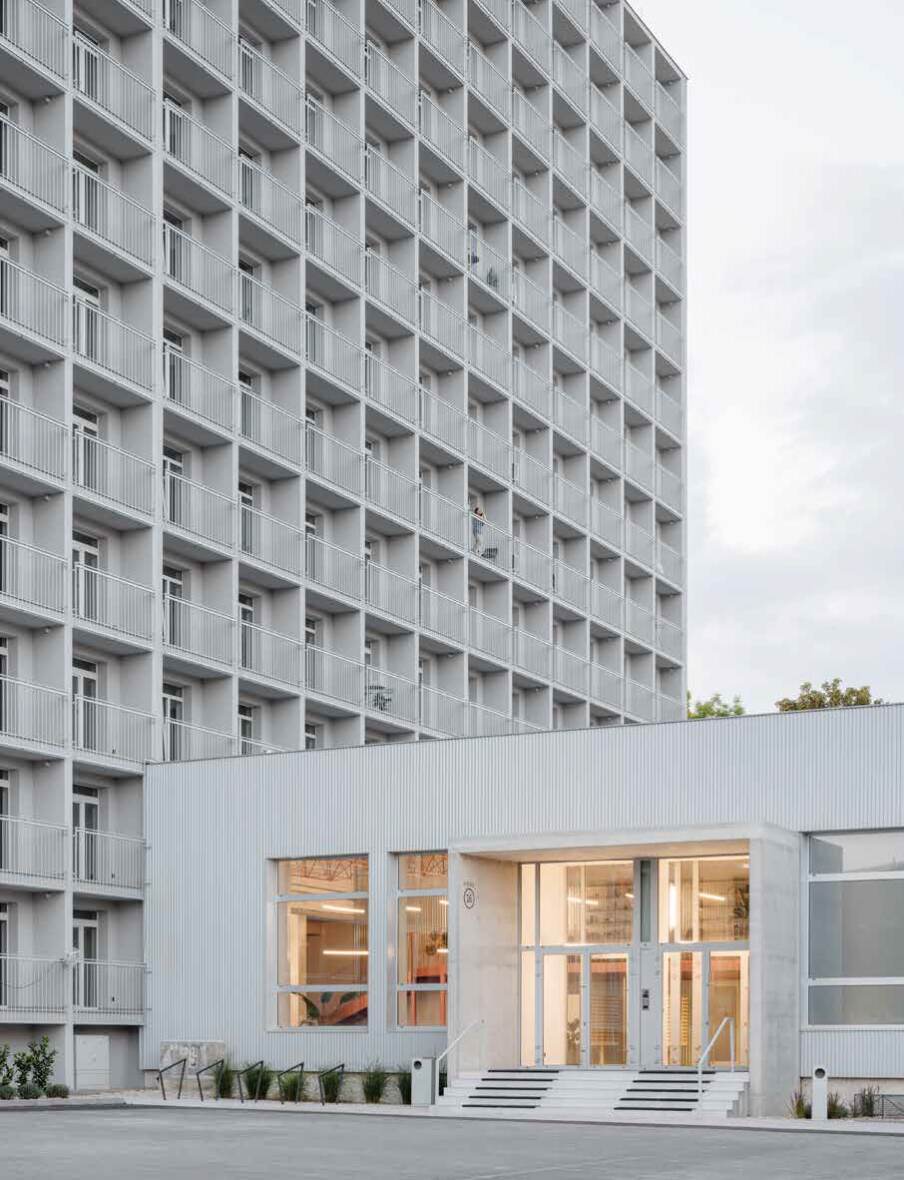 kopíruje geometriu panelovej konštrukcie. Vlnitý plech na fasáde vstupného