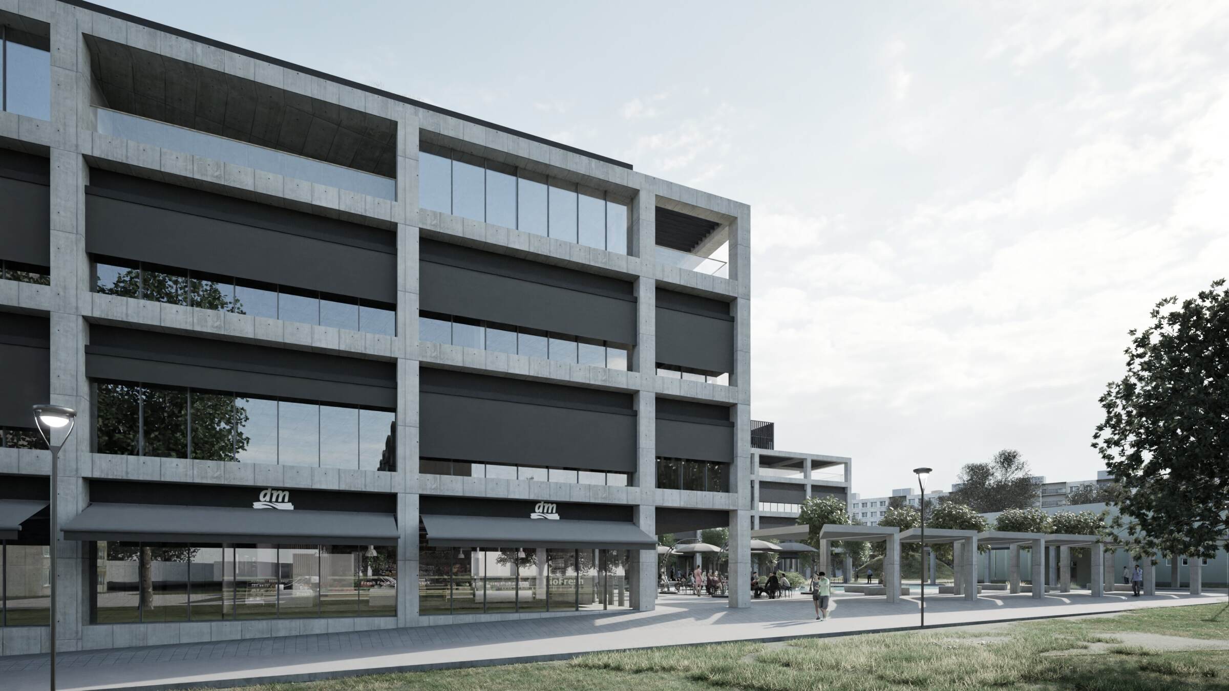 obchodného centra s ústredným námestím, doplnený o fontány, zelené plochy a